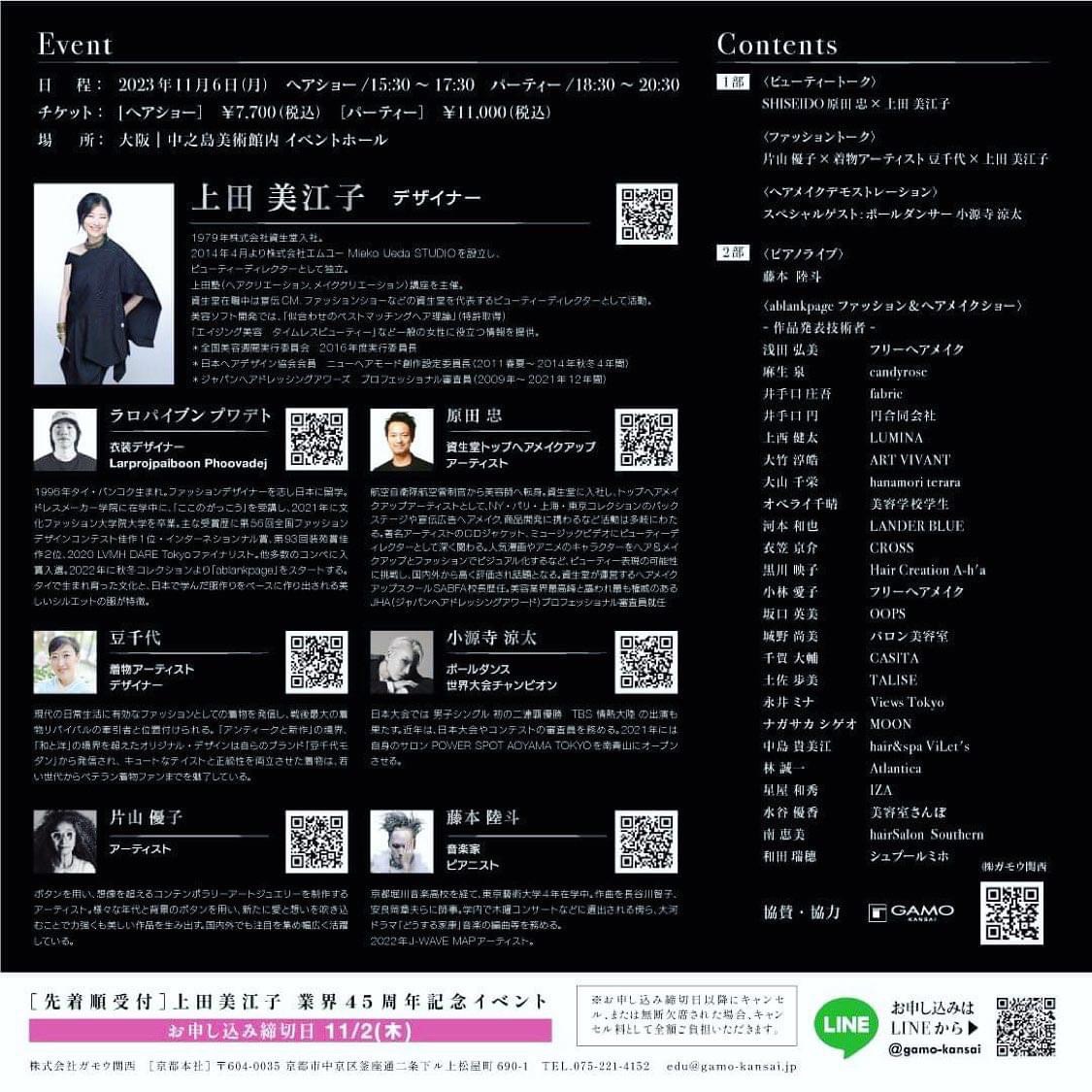 2023.11.6 大阪 中之島美術館にて ヘアメイクアップアーティスト上田美江子 業界45th記念イベント 「過去 現在 そして未来へ」 ヘア&ファッションショーに出演させていただきました。 ヘアメイク・ファッション・音楽・映像で織りなした美術館でのショーと舞台裏を是非ご覧ください。